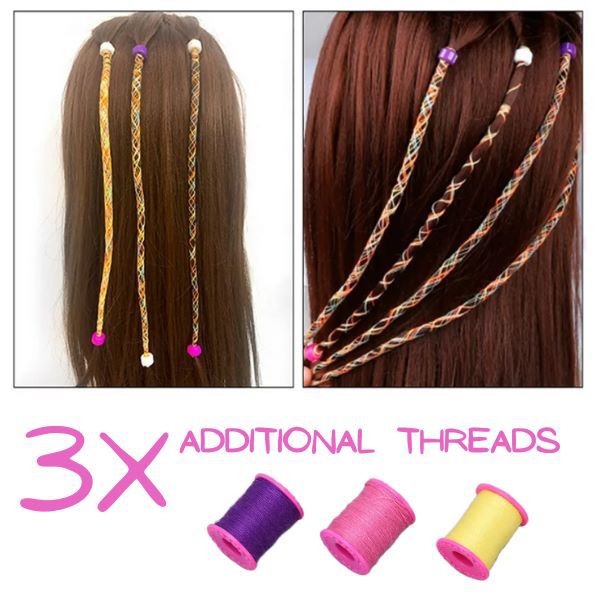 - Paket vsebuje: 1x pripomoček za pletenje kitk, 12x sponke za lase, 3x nit (rumena, roza in vijolična nit), 2x dodatek za lažjo uporabo.