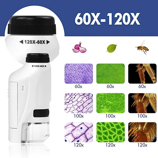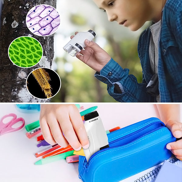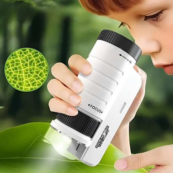 Opremljen z LED osvetlitvijo in 60- do 120-kratno povečavo lahko otroci odkrivajo fascinanten mikroskopski svet podnevi ali ponoči. Jasne in ostre slike jih bodo pritegnile in jih navdušile za nadaljnje učenje.