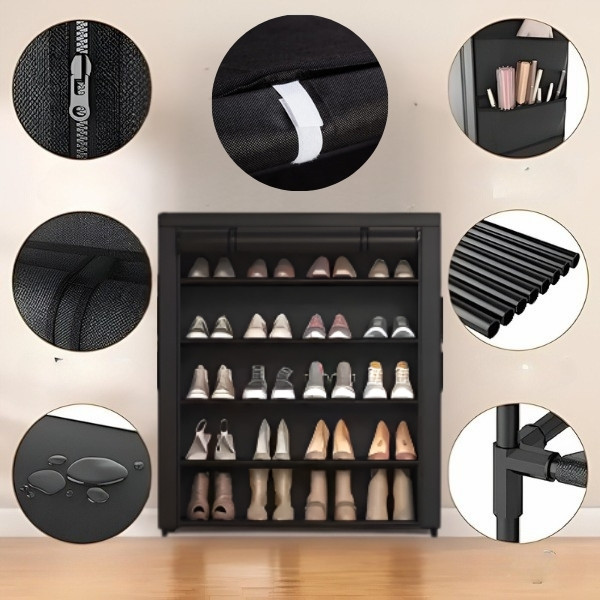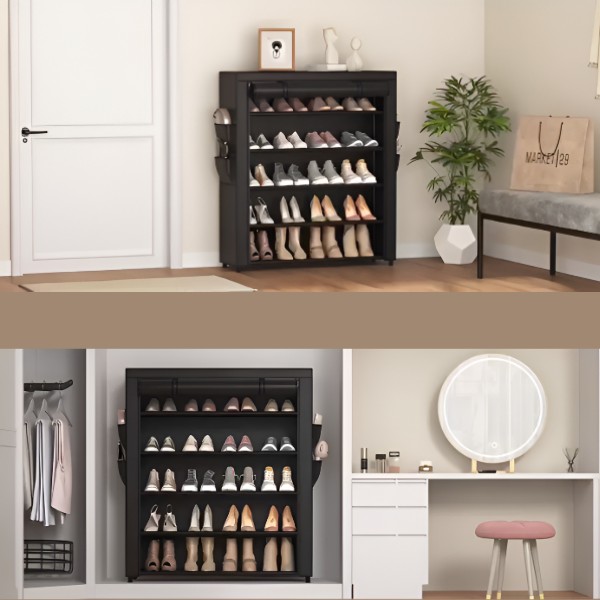 Opremljeno s tkaninsko prevleko, odporno na prah, in z zadrgo. To stojalo za čevlje zagotavlja, da vaši čevlji ostanejo čisti, zaščiteni pred prahom in umazanijo.